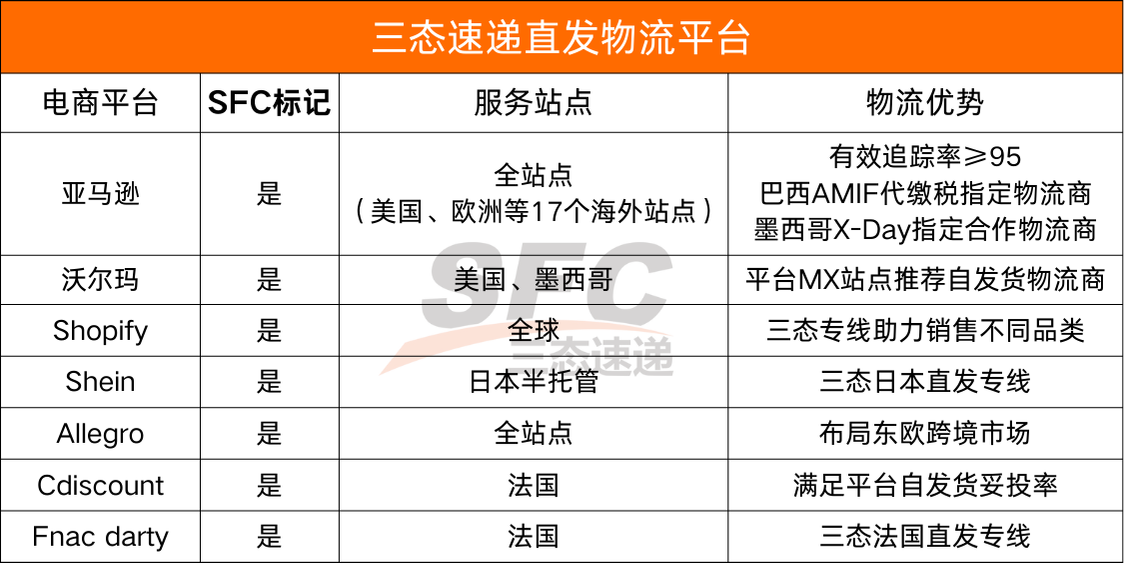 三态速递与Amazon、Walmart、Shopify等主流电商平台深度合作,为卖家提供带平台物流标记(SFC)的全链路可追踪服务。通过定制化方案,帮助卖家满足各平台物流绩效要求,实现一站式跨境履约。