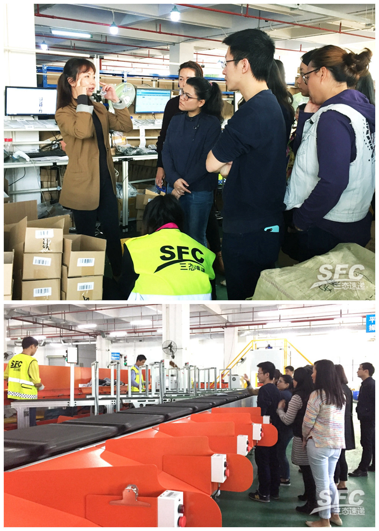 考察团先后到达三态速递的包裹处理中心和中国仓储中心进行参观。三态速递市场部和仓储中心负责人分别向Linio方详细讲解了三态速递各项物流设备和技术、各专线物流渠道、仓储中心管理运营方式等的优势特点,以及解答跨境物流行业方面的专业问题。