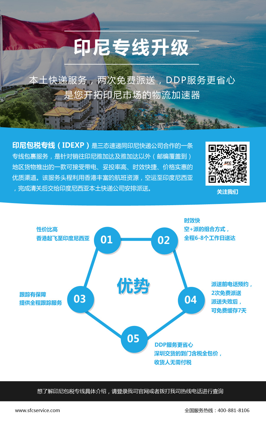 该线是三态速递(SFC)同印尼快递公司合作的一条专线包裹服务,是针对销往印尼雅加达及雅加达以外(邮编覆盖到)地区货物推出的一款可接受带电、妥投率高、时效快捷、价格实惠的优质渠道。该服务头程利用香港丰富的航班资源,空运至新加坡,再转至印尼进行清关,完成派送服务。
